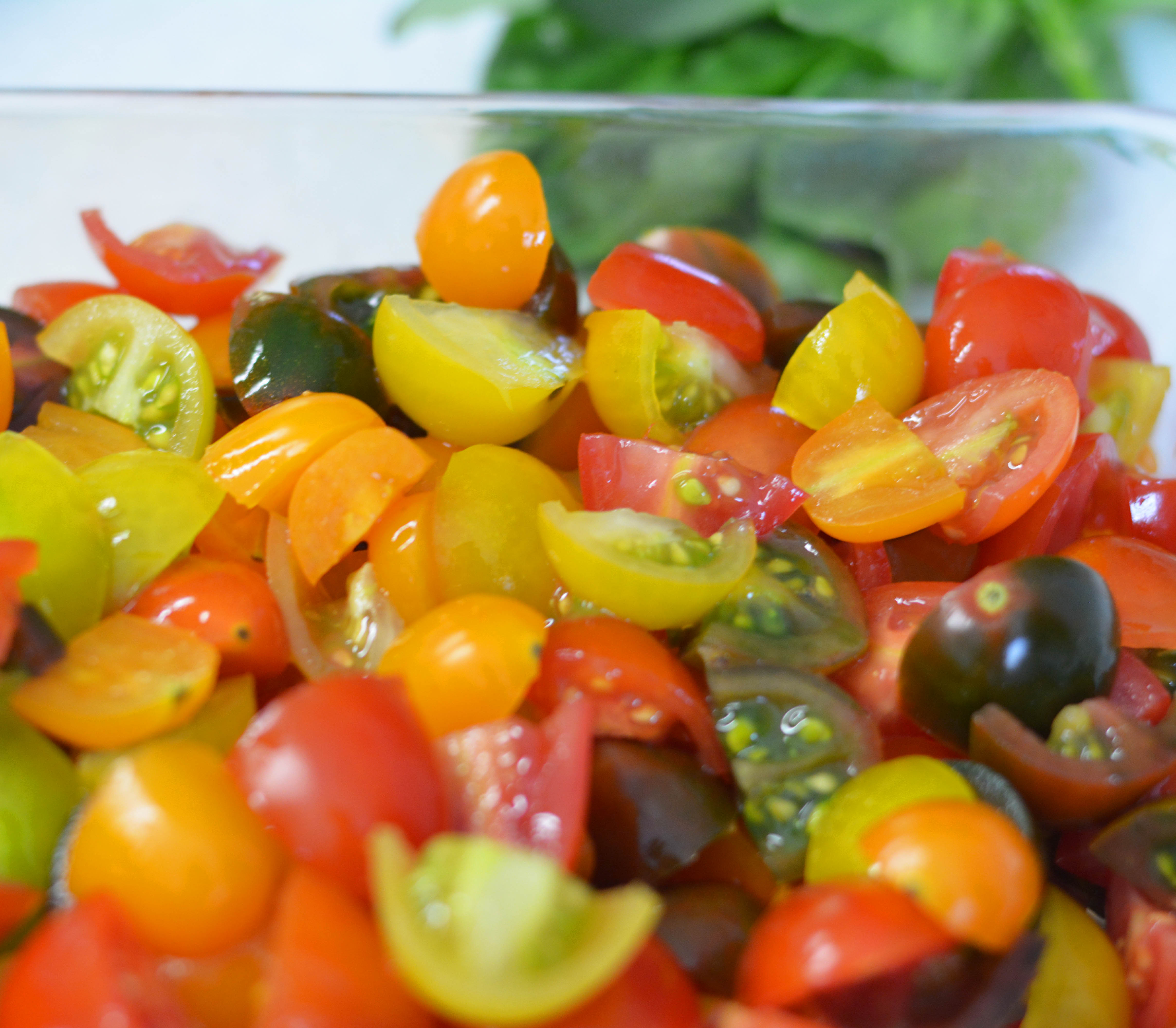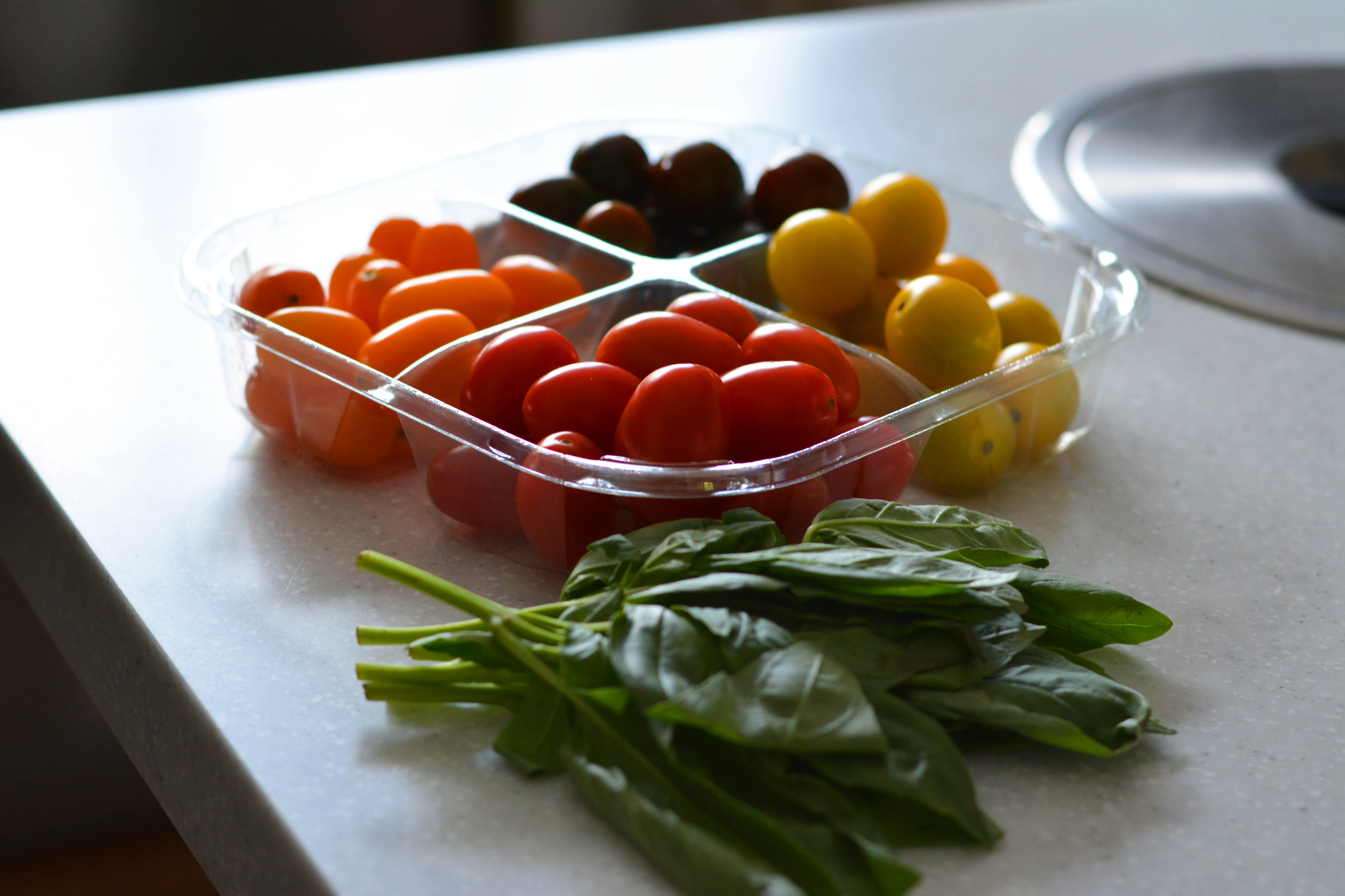 - Wash basil and cherry tomatoes. Set aside.